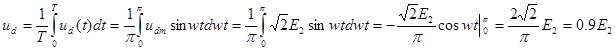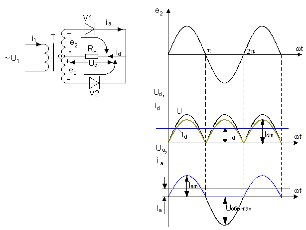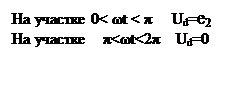 Рассмотрим интервал 0 < ωt < π: диод V1 – открыт; диод V2 – закрыт. Ud=e2 Udm=E2m=