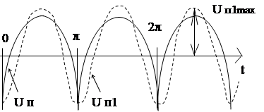 Наибольшую величину в кривой выпрямленного напряжения имеет 1-ая гармоника, частота которой гармонику наиболее трудно подавить фильтрами, поэтому по ее величине судят об искажении выпрямленного напряжения. На рисунке штриховой линией показана первая гармоника пульсации. Пульсация выпрямленного напряжения характеризуется коэффициентом пульсации. Коэффициент пульсаций