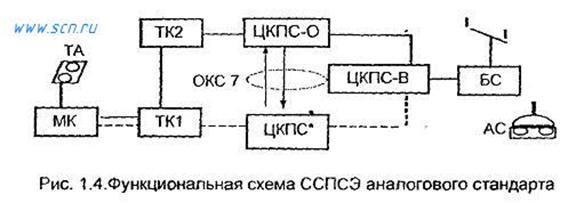 На функциональной схеме ССПСЭ аналогового стандарта (рис. 1.4) для каждой АС можно указать опорный центр коммутации (ЦКПС-О), в ОРМ которого зарегистрирована рассматриваемая АС. Когда эта АС оказывается в зоне обслуживания любого другого ЦКПС, сведения о ней записываются в ВРМ. Все такие центры коммутации для рассматриваемого абонента являются ЦКПС визитера (ЦКПС-В). Центр коммутации подвижной службы обеспечивает соединение между абонентами сети, а также выход в ТФОП; отслеживает местоположение АС в своей области обслуживания; управляет процедурой эстафетной передачи АС, а также переключением частотных каналов при нарушении связи из-за помех или неисправностей; выполняет функции центра эксплуатации и технического обслуживания сети; начисляет оплату абонентам. На рис. 1.4. показана установленная линия связи между абонентами сети ТФОП и ССПСЭ. В ТФОП показаны местный коммутатор (МК) и транзитные коммутаторы (ТК); ТА - телефонный аппарат. В варианте 1 (сплошные линии) вызов к АС проходит по линии ТА, МК, ТК1, ТК2, ЦКПС-О, ЦКПС-В, БС, АС. В ССПСЭ предусмотрена шлюзовая функция (Gateway). ЦКПС, обладающий такой функцией, обозначен ЦКПС*. Шлюзовая функция - специальный принцип маршрутизации вызова через ближайший ЦКПС, который теперь становится шлюзовым. Этот ЦКПС* опрашивает ЦКПС-О по каналам ОКС 7 и находит самый короткий путь для установления связи (линия связи обозначена пунктиром). Шлюзовую функцию реализуют, как правило, все ЦКПС.