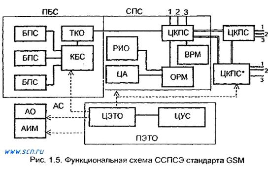 Рассмотрим ССПСЭ стандарта GSM (рис. 1.5). Схема содержит подсистему базовых станций (ПБС); сетевую подсистему (СПС) и подсистему эксплуатации и технического обслуживания (ПЭТО), а так же АС. В АС входит абонентское оборудование (АО) и абонентский идентификационный модуль (АИМ) (SIM-карта). Пока не установлен этот модуль, не выполняются соединения АС с вызывающим и вызываемым номером. Подсистема базовых станций содержит: базовые приемопередающие станции (БПС); контроллер БС (КБС) и оборудование транскодирования (ТКО). В составе СПС показаны: ЦКПС, ОРМ, ВРМ, центр аутентификации (ЦА), регистр идентификации оборудования (РИО). ПЭТО содержит центр эксплуатации и технического обслуживания (ЦЭТО) и центр управления сетью (ЦУС). Подсистема базовых станций выполняет функции радиосвязи. Все БС в зоне ПБС соединены линиями связи с контроллером. Каждая БПС обслуживает одну соту. Содержит несколько приемопередатчиков (до 16) - по одному для каждого частотного канала. Каждой БПС стандарта GSM доступны все 124 частотных канала, что позволяет реализовать метод скачкообразной перестройки частоты в стандарте GSM. Один из способов переключения частоты состоит в переключении модулирующего сигнала на входе передатчика. В этом случае число частот, используемых для скачкообразной перестройки, определяется числом приемопередатчиков БС. Контроллер БС управляет несколькими БПС. Основное назначение контроллера - правильное распределение радиоканалов между БС и АС и определение необходимости их переключений при передвижении. Другая его задача - управление конфигурацией БПС и загрузка программного обеспечения. Контроллер обеспечивает передачу вызова на АС, контролирует соединения, выполняет согласование скоростей передачи для речи, данных и сигналов вызова, кодирование и декодирование сигналов.