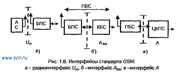 Количество приемопередатчиков, которые может обслужить один контроллер, может быть более 100. Оборудование транскодирования включается между КБС и ЦКПС и служит для согласования скоростей цифровых потоков. В ТКО образуется стандартный первичный цифровой поток (ПЦП) из цифровых сигналов базовых станций. ТКО может размещаться вместе с КБС. Как известно, ПЦП образуют 32 сигнала, каждый со стандартной скоростью 64 кбит/с. Номинальная скорость передачи ПЦП В1 = (30 + 2)*64 = 2048 кбит/с. В стандарте GSM скорость передачи сигнала в одном речевом канале S1GSM =13 кбит/с. В транскодере с помощью добавочных битов эта скорость увеличивается до величины B1ТК0= 16 кбит/с. Таким образом в полосе одного канала стандартной ИКМ передают сигналы четырех речевых каналов, всего речевых каналов в транскодере Nтко = 30 * 4 = 120. Оставшиеся два стандартных цифровых канала занимает сигнальная информация. Например, один канал - информация ОКС 7 и один канал - информация управления по протоколу Х.25. Сотовая сухопутная подвижная система электросвязи стандарта GSM территориально разделяется на зоны действия ЦКПС, которые, в свою очередь, делятся на зоны действия контроллеров БС, называемые зонами местоположения (ЗМ). ЦКПС отслеживает местоположение АС с помощью регистров. ВРМ позволяет вызывать АС, пока она находится в зоне действия, определенного контроллера. Когда АС перемещается в ЗМ другого контроллера, он ее регистрирует, и в ВРМ записывается новый адрес ЗМ. Входящие вызовы поступают к ЦКПС* - центру коммутации, обладающему шлюзовой функцией, который по номеру вызываемого абонента находит его ОРМ. Последний обращается к ВРМ, который "находит" АС. Шлюзовой ЦКПС* имеет интерфейс с внешними сетями связи. Здесь, как и в случае аналоговых систем, шлюзовую функцию можно установить для каждого ЦКПС. Все ЦКПС в сети Соединены линиями связи (ВОЛС, РРЛ, спутниковыми). На рис. 1.5 они показаны двойными линиями. Система стандарта GSM подчиняется принципам эталонной модели OSI. Она имеет три общих внутрисистемных интерфейса: радиоинтерфейс Um между БС и АС, 2) интерфейс А между КПС и ПБС, 3) интерфейс Abis между БПС и КБС. Положение внутрисистемных интерфейсов отражено на рис. 1.6. В данном контексте интерфейс - это точка соединения реально существующих устройств. Благодаря данным интерфейсам оператор системы может Соединять аппаратуру разных производителей. Информационные потоки, проходящие через один интерфейс, могут принадлежать различным протоколам. Кроме этих внутрисистемных интерфейсов система GSM имеет интерфейсы между сетью и внешним оборудованием и интерфейс для выхода во внешние сети: в сети подвижной связи общего пользования, в ТФОП, в цифровые сети с интеграцией служб (ЦСИС) и др.