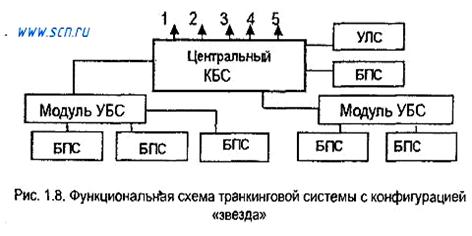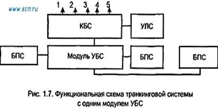На функциональной схеме базового варианта транкинговой системы (рис. 1.7) с одним модулем управления базовой станцией (УБС) показаны: базовые приемо-передающие станции (БПС); контроллер базовой станции (КБС); терминал управления локальной сетью (УЛС). Абонентские станции сети подразделяются на стационарные и подвижные радиостанции. Функции БПС: передача и прием, пространственно разнесенный прием, шифрование сигналов, управление радиоканалами, управление выходной мощностью АС. Каждое из двух других устройств схемы (КБС и модуль УБС) выполняет функции коммутации для нескольких БС, служит для выхода во внешние сети, позволяет подключать терминалы техобслуживания, диспетчерские пульты. На рис. 1.7 и 1.8 цифрами обозначены выходы: 1 - в ТФОП, 2 - в цифровую сеть с интеграцией служб (ЦСИС), 3 - в сеть с коммутацией пакетов (СКП), 4 - в учрежденческую АТС (УАТС), 5 - другие.