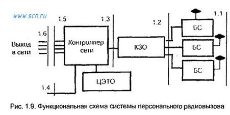 Система персонального радиовызова обеспечивает одностороннюю передачу коротких сообщений на ограниченной территории по радиоканалу. Эта услуга электросвязи известна также под названием "пейджинг". Информация для передачи может поступать через различные сети. Например, широко распространены системы, в которых диспетчер сети получает речевую информацию по телефону из ТФОП. Основные технические характеристики радиоинтерфейса СПРВ определяются форматом кодов сигналов радиовызова. Существует множество форматов кодов СПРВ. С 1992 г. в Европе широкое признание получил цифровой формат ERMES (European Radio Messaging System). Этот общеевропейский формат позволяет организовать общую сеть персонального радиовызова для всех стран и общеевропейский роуминг. Функциональная схема СПРВ на базе ERMES (рис. 1.9) содержит базовые станции (БС); контроллер зоны обслуживания (КЗО); контроллер сети; центр эксплуатации и технического обслуживания (ЦЭТО). Цифрами 1.1,..., 1.6 обозначены интерфейсы, которые должны отвечать определенным протоколам взаимодействия.