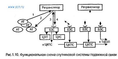 Спутниковая система подвижной связи (ССПС) содержит: космический сегмент, земной сегмент, линии радиосвязи и абонентские терминалы (AT). Космический сегмент образуют ретрансляторы на ИСЗ. В земной сегмент входят базовые земные станции (БЗС), центр управления сетью (ЦУС) и центр управления полетом (ЦУП). ЦУС планирует использование ресурсов спутника в системе, распределяет ресурсы ретрансляторов ИСЗ между БЗС, обеспечивает БЗС данными для слежения за ИСЗ. Он же планирует трафик. Центр управления полетом контролирует орбиты ИСЗ, обрабатывает телеметрию, формирует команды, передает на ЦУС сведения о состоянии и ресурсе ИСЗ. Как правило, центры подключены к одной из БЗС и не имеют собственного радиотехнического оборудования. Вся телеметрия и управление выполняются через БЗС по радиоканалам. БЗС также называют станциями сопряжения или шлюзовыми станциями. Все соединения между абонентами спутниковой системы выполняются через БЗС. Для этого в схеме БЗС предусмотрены интерфейсы. Часто БЗС соединяются линиями связи с ЦКПС ССПСЭ. Линии радиосвязи подразделяются на мобильные, фидерные, межспутниковые, командные и телеметрические. Мобильные - это линии радиосвязи с абонентскими терминалами. На рис. 1.10 это линия / "вверх" и линия 2 "вниз". Линии радиосвязи с БЗС называются фидерными. На рис 1.10 это линия 3 "вверх" и линия 4 "вниз". В некоторых спутниковых системах связи организованы межспутниковые линии между соседними ретрансляторами на одной орбите и на соседних орбитах. Командные и телеметрические линии как правило совмещены с фидерными.