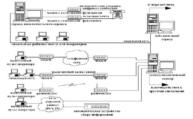 Автономный пейджинговый терминал содержит базу данных абонентов, в соответствии с которой и производится формирование низкочастотного модулирующего сигнала на передатчик. Обычно автономный терминал выполняется в виде специализированной микроЭВМ, однако при увеличении числа абонентов он становится очень дорогостоящим устройством. Это вынудило разработчиков отказаться от хранения базы данных абонентов внутри терминала и перейти к выпуску неавтономных терминалов. Неавтономный пейджинговый терминал не содержит в себе базу данных абонентов и используется совместно с персональным компьютером. При этом он выпускается как во внутреннем (дополнительная плата в компьютер), так и во внешнем исполнении (отдельное устройство, соединяющееся с компьютером кабелем связи). Неавтономный пейджинговый терминал формирует низкочастотный модулирующий сигнал на передатчик в соответствии с получаемым от компьютера командами и данными. Персональный компьютер, работающий совместно с неавтономным пейджинговым терминалом, называется пейджинговый сервер, а программное обеспечение, функционирующее на нем - программным обеспечением пейджингового сервера. Для передачи сообщения терминал взаимодействует с передатчиком пейджинговой системы, управляя им, и подавая на него низкочастотный модулирующий сигнал, и передает сообщение на рабочей частоте. Выходная мощность передатчика и высота подвеса антенны определяют зону приема сообщений пейджерами абонентов. Передатчик пейджинговой системы и ее терминал, а в случае неавтономного терминала ее пейджинговый сервер со своим программным обеспечением, работая совместно, представляют функции базовой службы отправки сообщений. Пейджинговый терминал получает отправляемые сообщения от системы сбора информации, которая предоставляет функции базовых служб подготовки сообщений. Как правило, первой реализуемой частью этой системы является локальная сеть рабочих мест операторов, обеспечивающая функции базовой службы подготовки сообщений при помощи операторов. Она предназначена для приема сообщений, которые поступают по телефонным линиям в виде обычных звонков, и ввода их в пейджинговую систему для передачи абонентам. Эта часть системы сбора информации строится на основе нескольких персональных компьютеров с работающим на них программным обеспечением оператора пейджинговой станции, которые соединены в локальную сеть, подключенную к пейджинговому серверу. Оборудование рабочих мест операторов с работающим на нем программным обеспечением предоставляет функции службы подготовки сообщений при помощи операторов. Следующей частью системы сбора информации являются вынесенные рабочие места операторов. Она позволяет предоставить удаленным операторам доступ к основной системе. Вынесенное рабочее место оператора организуется на основе персонального компьютера с модемом, работающего под управлением программного обеспечения удаленного доступа и соединенного с основной системой по телефонным или иным каналам связи. Как правило, отдельное удаленное место оператора соединяется с основной системой по обычной телефонной линии с помощью модема, а в случае ее отсутствия по радиоканалу с применением радиомодема. Иногда возникает необходимость в создании локальной сети вынесенных опера