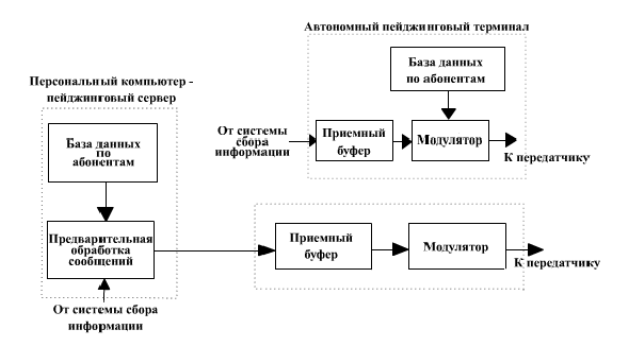 Основным устройством каждой пейджинговой системы является пейджинговый терминал. Он получает сообщения, передаваемые абонентами от системы сбора информации, формирует низкочастотный модулирующий сигнал на передатчик в соответствии с принятым пейджинговым протоколом и управляет пейджинговым передатчиком или их системой по каналам связи. Пейджинговый терминал может выпускаться в автономном и неавтономном исполнении, как показано на рис.8.
