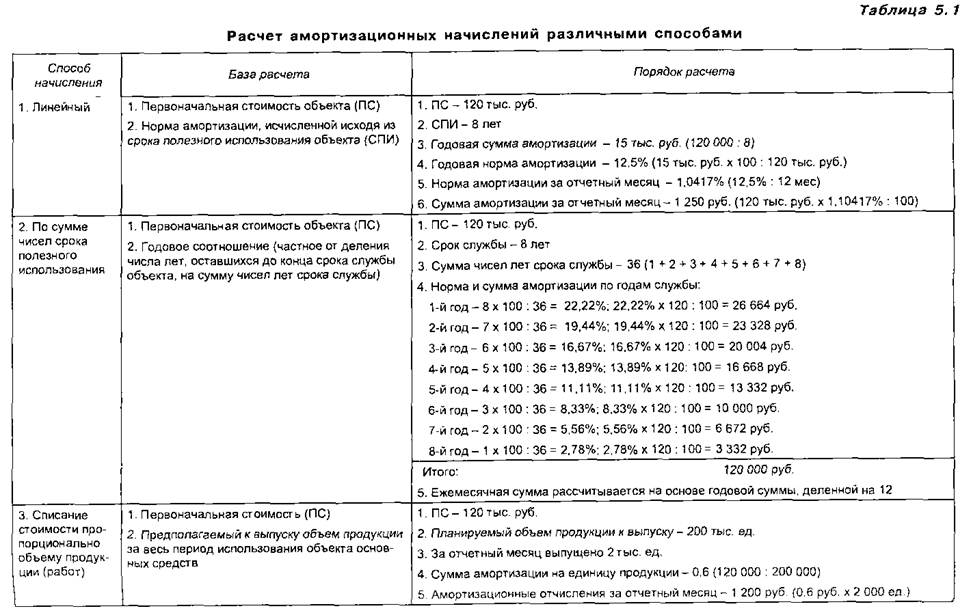 где Cп — первоначальная стоимость основных средств: Сл — ликвидационная стоимость основных средств; Т — срок полезного использования основных средств, лет. Для многих видов оборудования установлены различные нормы амортизационных отчислений в зависимости от того, на предприятиях какого типа производства оно эксплуатируется — массового, крупносерийного, мелкосерийного или единичного. При начислении амортизации способом уменьшаемого остатка норма амортизации применяется не к первоначальной, а к остаточной стоимости объекта основных средств. В результате этого база для расчета амортизации из года в год уменьшается и за весь срок полезного использования объекта его первоначальная стоимость не будет перенесена на стоимость произведенной продукции. Себестоимость продукции будет занижаться, и к концу срока использования останется значительная недоамортизируемая стоимость объекта. Пример. Первоначальная стоимость объекта — 120 тыс. руб., срок его полезного использования — 8 лет, годовая норма амортизации — 12,5%. Следовательно, годовая норма амортизации принимается равной 25% (12.5% *2). Сумма начислений амортизации составит: 1-й год — 120 тыс. руб. х 25% = 30 тыс. руб. 2-й год — (120 тыс. руб. — 30 тыс. руб.) * 25% = 22,5 тыс. руб. 3-й год — (90 тыс. руб. — 22,5 тыс, руб.) * 25% = 16,8 тыс. руб. 4-й год — (67,5 тыс. руб. — 16,8 тыс. руб.) х 25% = 12,7тыс. руб. 5-й год — (50,7 тыс. руб. — 12,7 тыс. руб.) х 25% = 9,5 тыс. руб. 6-й год — (38.0 тыс. руб, — 9.5 тыс. руб,) х 25% = 7,1 тыс. руб, 7-й год — (28,5 тыс. руб. — 7,1 тыс, руб.) * 25% = 5,4 тыс. руб. 8-й год — (21,4тыс. руб. — 5,4тыс. руб. = 16.0 тыс. руб., или 120тыс. руб. — 104 тыс. руб., т. е. сумма начисленной амортизации за 7 лет. Именно эта сумма 16 тыс. руб. принимается в качестве амортизационных отчислений в последний год срока полезного использования объекта. В результате общая сумма начисленной амортизации за 8 лет равна первоначальной стоимости объекта — 120 тыс. руб. (30,0 + 22,5 + 16,8 + 12,7 + +9,5 + 7,1 + 5,4 + 16,0). Как видно из приведенных данных, даже при применении коэффициента ускорения, равного двум, сумма амортизации за весь срок полезного использования объекта может оказаться значительно меньше его первоначальной стоимости. Поэтому без введения коэффициента ускорения данный способ практически неприменим. Между тем коэффициент ускорения применяется только по перечню высокотехнологичных отраслей и эффективных видов машин и оборудования, устанавливаемому федеральными органами исполнительной власти. Таким образом, при любом способе начисления амортизации общая сумма амортизационных отчислений за весь срок полезного использования объекта равна первоначальной стоимости основных средств (а с учетом переоценки основных средств — их восстановительной стоимости).