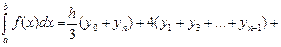 Формула Симпсона получается при замене двух соседних элементарных трапеций на трапецию, ограниченную сверху параболой. Из рис. 5.4 явствует, что формула трапеций более точна, чем формулы прямоугольников. Заметим, что правая часть в (5.20) есть среднее арифметическое правых частей в (5.18) и (5.19). В свою очередь формула Симпсона точнее формулы трапеций. При увеличении числа разбиений n отрезка [ a, b ] погрешности каждой из приведенных формул уменьшаются.