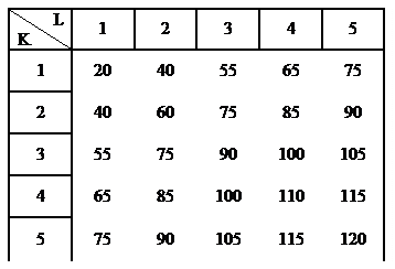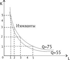 Для того чтобы построить изокванты, обратимся к данным таблицы: в ней приведен максимальный выпуск продукции, достигаемый при различных сочетаниях факторов производства. Из таблицы видно, что один и тот же объем производства можно получить при различных комбинациях факторов производства. Объем производства, равный 55 можно получить в двух случаях: при К=3 и L=1, а также при К=1 и L=3. Объем производства, равный 75: при К=5 и L=1; при К=3 и L=2; при К=2 и L=3; при К=1 и L=5.