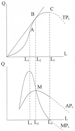 На рисунке изображены графики продуктов труда: суммарного TPL в верхней части, среднего APL и предельного MPL в нижней части. Когда затраты L=0, то выпуск тоже равен 0. Суммарный продукт вырастает до определенной точки, а затем начинает сокращаться, до этого момента использование каждой дополнительной единицы увеличивает производительность оборудования. После указанной точки дополнительные трудозатраты неэффективны. Кривые среднего и предельных продуктов тесно связаны. MPL достигает "max" значительно раньше, чем APL. APL пересекается с MPL в точке "max" APL.