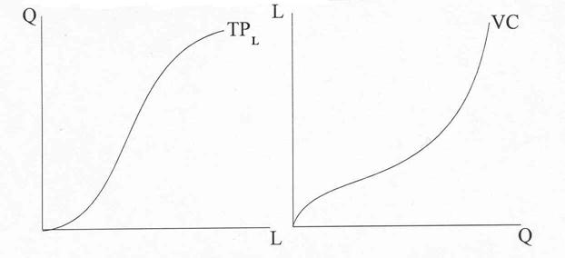 то есть средние постоянные затраты и средние переменные затраты равны в сумме средним суммарным издержкам. Прежде чем графически изображать различные формы затрат, отметим зависимость между издержками производства и объёмом выпускаемой продукции (рис. 39.). Издержки производства находятся в обратной зависимости от объёма выпускаемой продукцию. Проще говоря, чем с меньшими издержками производится продукция, тем больше будет её выпуск. Функция переменных издержек является обратной по отношению к функции суммарного продукта. VC= f (Q). По оси ординат отложены затраты на приобретения труда.