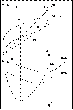 равны наклону луча ОА. В точке А тангенс угла наклона принимает минимальное значение. В любой другой точке на кривой ТС тангенс угла наклона луча будет иметь большое значение. Проекция точки А на рис. 40 б будет соответствовать минимуму АТС. Подобным образом можно описать и кривую средних переменных издержек. В этом случае тангенс угла наклона луча, выходящего из начала координат, касательного к кривой переменных издержек VC в точке В, соответствует минимальным AVC. Расстояние между кривыми АТС и AVC по вертикали для любого заданного объёма выпуска равно величине средних издержек. Это следует из того, что ATC=AFC+AVC => AFC=ATC-AVC.