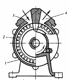 Рис.6. Схема динамического насоса трения КРК: 1-корпус; 2-лопасть; 3-камера всасывания; 4-камера нагнетания