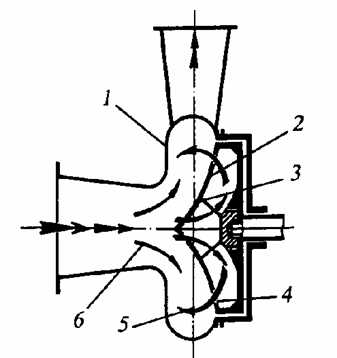 Рис.2. Центробежный насос: 1-рабочее колесо; 2-корпус; 3-камера всасывания; 4-нагнетательный патрубок; 5-сальник.