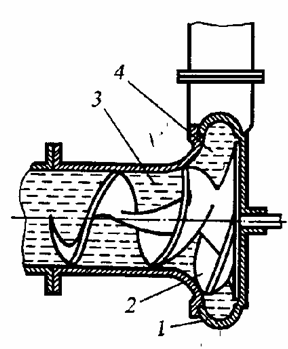 В насосах этого типа продукт с жидкостью поступивший в камеру всасывания 3, подхватывается вращающейся лопастью, имеющей вид сужающегося шнека (спирали), и за счет силы трения перемещаемая среда скользит по наружной поверхности лопасти и внутренней поверхности корпуса 1, направляясь в камеру нагнетания 4. Насос развивает напор до 30 м, имеет подачу до 140 • 10-3 м3/с.