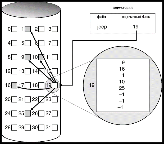 При индексируемом размещении, в отличие от предыдущих, все указатели на блоки файла собраны вместе в индексный блок (i-node, superblock). Используется индексная таблица, ссылающаяся на блоки данных файла. Подобная система используется в системах UNIX, Linux, Solaris. Пример индексируемого размещения приведен на рис. 20.5.