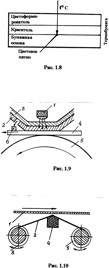 Создают изображение на бумаге путем сконцентрированного в нужном месте локального нагрева. Бумага, при этом, должна иметь очень тонкое термочувствительное покрытие с двумя раздельными бесцветными компонентами (рис. 1.8). При локальном нагревании цветоформирователь (1-й компонент), смешиваясь с предварительно обесцвеченным красителем (2-й компонент), образует на бумажном слое видимое пятно. Возможна печать различными цветами.