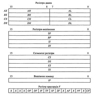 Програмна модель. Програмна модель МП i8086 (рис. 1) складається з РЗП, сегментных регістрів, вказівника команд і регістра прапорців. РЗП (Регістри загального призначення) поділяються на регістри даних і регістри-вказівники. До регістрів даних відносять чотири 16-розрядні регістри: АХ, ВХ, СХ, DX. Кожний із цих регістрів складається з двох 8-розрядних регістрів, які можна незалежно адресувати за символічними іменами АН, ВН, СН, DH (старші байти - High) та AL, BL, CL, DL (молодші байти -Low). Регістри-вказівники SP (Stack Pointer - вказівник стека), ВР (Base Pointer - базовый регістр), SI (Source Index - індекс джерела), DI (Destination Index - індекс призначення) є 16-розрядними. Усі РЗП можна використати для зберігання даних, але в деяких командах допускається використання певного регістра за замовчуванням: АХ - при множенні, діленні, введенні та виведенні слів; AL - при множенні, діленні, введенні та виведенні байтів, десятковій корекції, перетворенні байтів (команда XLAT); АН - при множенні і діленні байтів; ВХ - при трансляції; СХ- як лічильник циклів і вказівник довжини рядків у рядкових командах; CL - для зберігання зміщення з указанням змінної; DX - при множенні та діленні слів, введенні та виведенні з непрямою адресацією; SP - при операціях зі стеком; SI, DI - при рядкових операціях. На відміну від 8-розрядних МП регістр SP зберігає зміщення останньої зайнятої комірки стека відносно початку сегмента стека, а повна адреса стека визначається як SS:SP.