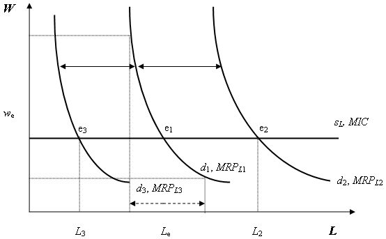 Рис. 2. Кривая предложения ресурсов для предпринимателя Цены на ресурсы в действительности изменяются, когда изменяются рыночный спрос и предложение. Однако количество ресурсов, закупаемых отдельной фирмой в условиях совершенной конкуренции, не влияет на общий рыночный спрос. Оплата дополнительно закупаемого ресурса – это предельные затраты фирмы на данный ресурс MIC (marginal input cost). В условиях совершенной конкуренции они равны равновесной цене. Дополнительный продукт, полученный от использования дополнительной единицы ресурса – предельный продукт MP. Прирост дохода фирмы от его реализации – предельная доходность ресурса (MRP – marginal revenue product) или предельный продукт в денежном выражении. Он равен: MRP=MR·MP. Графически предельная доходность ресурса – это кривая спроса на него. Она имеет отрицательный наклон, т. к. отражает убывающую доходность (убывающую производительность) ресурса: чем больше единиц одного ресурса использует фирма при прочих постоянных ресурсах, тем ниже ее предельная производительность. Выбор фирмой количества используемого ресурса основывается на равенстве MRP=MIC. Это равенство и отражает оптимум фирмы, т. е. условие максимизации прибыли. Отмеченное в предыдущем параграфе характерно для любого ресурса, в том числе и для рынка труда. Кривая предложения труда, какой она видится каждому отдельному нанимателю в условиях совершенной конкуренции, представляет собой горизонтальную линию, пересекающуюся с вертикальной осью в точке, соответствующей равновесной цене труда, we (wage). Кривая спроса фирмы на труд dL показывает, как изменяется объем требующегося фирме труда при изменении его цены w и прочих неизменных параметрах. При любой ставке заработной платы выше w e количество нанятых работников будет меньше L e, при w < w e, работников потребуется больше L e. Обратная зависимость между уровнем заработной платы и количеством нанимаемых работников является следствием снижения предельного продукта труда MPL по мере использования все большего объема трудового ресурса. Таким образом, кривые спроса на труд, как и кривые спроса на выпускаемую продукцию, имеют отрицательный наклон, что обусловлено законом убывания предельной полезности. Изменения в ценах на труд приводят к движению вдоль кривой спроса, изменения других факторов – к сдвигу кривой спроса.