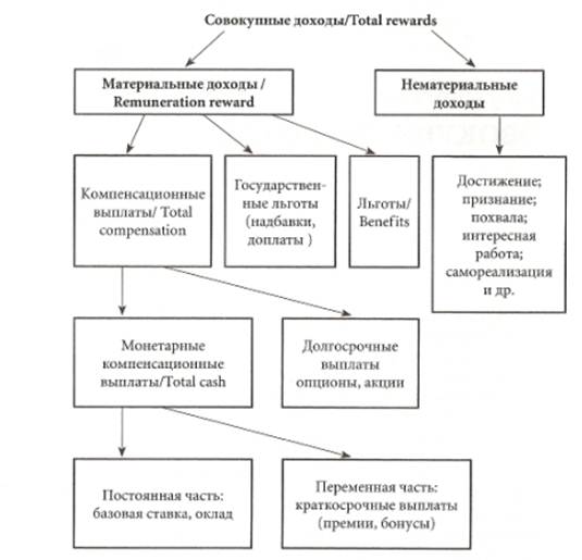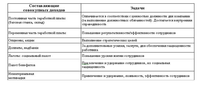 Совокупные доходы/Тоtаl rewards - включают все доходы сотрудника в процессе трудовых отношений: материальные доходы (remul1eratiol1 reward) плюс нематериальные: значимость работы, признание, статус, полномочия, возможность роста, развития и др. Материальные доходы/Rеmunегаtiоп геwагd – включают в себя компенсационные выплаты, государственные льготы: надбавки, доплаты, и льготы Компенсационные выплаты/Тоtаl compensation - фиксированная и переменная части заработной платы, включающие денежную форму оплаты, а также опционы и акции. Монетарные компенсационные выплаты/Тоtаl cash состоят из: - постоянная часть заработной платы: оклад или базовая ставка, которую работодатель выплачивает сотруднику за выполнение работы согласно должностным обязанностям; - переменная часть заработной платы: премии, которые выплачиваются в зависимости от результативности деятельности сотрудников. Постоянная часть заработной платы не подлежит регулярному пересмотру и не зависит от результатов деятельности сотрудника в данный период времени. Здесь возможны варианты оплаты по тарифной системе, с учетом тарифного разряда и установленных норм труда, и по бестарифной системе, с оплатой по ежегодной или ежемесячной ставке. Переменная часть заработной платы в отличие от базовой ставки должна зависеть от результатов деятельности сотрудника за определенный период. То есть, если результативность сотрудника падает, то премиальная часть заработной платы автоматически снижается. Выплаты могут производиться регулярно по итогам отчетного периода (месяц, квартал, год, несколько лет) или после завершения проекта. Компенсационные выплаты могут быть долгосрочными и краткосрочными. Краткосрочные выплаты – период месяц, квартал. Долгосрочные выплаты – по результатам работы за полгода, год. Льготы - различные программы, которые работодатель использует для дополнения монетарных компенсационных выплат. Сотрудникам выплачиваются также все доплаты в соответствии с трудовым законодательством: оплата за работу в выходные и нерабочие праздничные дни, оплата сверхурочной работы (ст. 146-158 ТК РФ), а также денежные выплаты, установленные в целях возмещения работникам затрат, связанных с исполнением ими трудовых обязанностей: при направлении в служебные командировки, при совмещении работы с обучением и т.д. (ст. 165-188 ТК РФ), районное регулирование. Государственное районное регулирование заработной платы и доходов населения осуществляется на основе районных коэффициентов и северных надбавок. Существующая система районного регулирования, сформированная в условиях всеобъемливающего государственного планирования и жесткого центрального управления экономикой, учитывает в основном два фактора: различия в потребностях населения, занятого трудом равной тяжести и сложности (квалификации), и различия в уровне потребительских цен по районам. В уральском округе районный коэффициент составляет 15%. Нематериальная часть компенсации существенно влияет на поведение и эффективность сотрудников. Возможность достижения высоких результатов, признание его заслуг коллективом, обществом, интересная работа, условия для профессионального развития - вот основные факторы, влияющие на принятие сотрудником решения о работе в компании и лояльности к ней. Задачи, которые решают основные составляющее совок
