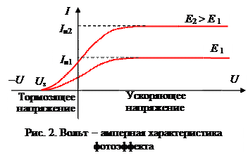 Вентильный фотоэффект -это возникновение ЭДС при освещении контакта полупроводников (полупроводника и металла) при отсутствии внешнего поля.Это путь прямого преобразования солнечной энергии в электрическую. В 1888-1890 годах А.Г. Столетов провел систематическое исследование внешнего фотоэффекта. Облучая катод светом различных длин волн, Столетов установил следующие свойства фотоэффекта: 1) под действием света вещество теряет только отрицательные заряды; 2) наиболее эффективное действие оказывают ультрафиолетовые лучи; 3) фотоэффект практически безынерционен, т.е. промежуток времени между моментом освещения и началом разрядки ничтожно мал. Экспериментальная установка позволяет получить вольт-амперные характеристики фотоэффекта – зависимости фототока I (поток электронов, испускаемых катодом под действием света) от напряжения U между электродами при различных световых потоках (Е 1 ¹ Е 2) и постоянной частоте света n. При изучении вольт-амперных характеристик было установлено следующее. 1. Фототок возникает не только при U = 0, но и при U < 0, причем фототок отличен от нуля до строго определенного для данного катода отрицательного значения U = U з- задерживающего потенциала. Величина U з не зависит от светового потока (совпадение начальных точек обеих кривых). 2. Пологий ход кривых указывает на то, что электроны вылетают из катода с различными скоростями. При напряжении U = U з сила фототока равна нулю, т.е. ни одному из электронов, даже обладающему при вылете из катода наибольшим значением скорости v max не удается преодолеть задерживающее поле и достигнуть анода.