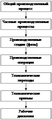 По своей сути производственный процесс представляет собой совокупность логически связанных действий и операций, в результате выполнения которых происходит преобразование исходных производственных ресурсов в готовую продукцию. С экономической точки зрения производственный процесс представляет собой процесс целенаправленного воздействия средств труда на предметы труда с целью формирования новой добавленной стоимости. Поскольку базовым элементом производственного процесса является живой труд, интегрирующий вещественные факторы производства, то любой производственный процесс в первую очередь является трудовым процессом. Структура производственного процесса имеет следующее логическое деление (рис. 2.1.1).
