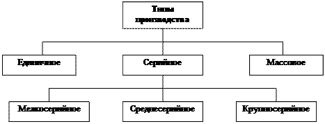 Выбор оптимальных методов построения производственного процесса во времени и пространстве в первую очередь определяется типом соответствующего производства. Тип производства представляет собой организационно-техническую характеристику производственной системы, выражающую ее индивидуальные особенности в форме таких признаков, как: 1. широта номенклатуры выпускаемой продукции 2. объемы выпуска однотипных изделий 3. частота изменения номенклатуры продукции 4. характер специализации рабочих мест и производственных подразделений 5. преобладающий тип технологического оборудования 6. преобладающий способ построения производственного процесса во времени В зависимости от сочетания указанных признаков, принято различать три типа производственных процессов или три типа производства: единичное, серийное и массовое (рис. 2.3.1).