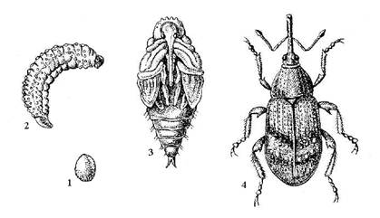 Рис. 2. Яблонный цветоед (полное превращение): 1 – яйцо; 2 – личинка; 3 – куколка; 4 – взрослое насекомое