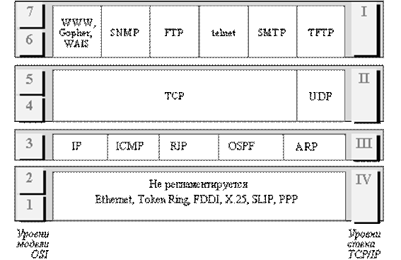 Самый нижний (уровень IV) соответствует физическому и канальному уровням модели OSI. Этот уровень в протоколах TCP/IP не регламентируется, но поддерживает все популярные стандарты физического и канального уровня. Следующий уровень (уровень III) - это уровень межсетевого взаимодействия, который занимается передачей пакетов с использованием различных транспортных технологий локальных сетей, территориальных сетей, линий специальной связи и т. п. В качестве основного протокола сетевого уровня (в терминах модели OSI) в стеке используется протокол IP, который изначально проектировался как протокол передачи пакетов в составных сетях, состоящих из большого количества локальных сетей, объединенных как локальными, так и глобальными связями. Поэтому протокол IP хорошо работает в сетях со сложной топологией, рационально используя наличие в них подсистем и экономно расходуя пропускную способность низкоскоростных линий связи. Протокол IP является дейтаграммным протоколом, то есть он не гарантирует доставку пакетов до узла назначения, но старается это сделать. К уровню межсетевого взаимодействия относятся и все протоколы, связанные с составлением и модификацией таблиц маршрутизации, такие как протоколы сбора маршрутной информации RIP (Routing Internet Protocol) и OSPF (Open Shortest Path First), а также протокол межсетевых управляющих сообщений ICMP (Internet Control Message Protocol). Последний протокол предназначен для обмена информацией об ошибках между маршрутизаторами сети и узлом - источником пакета. С помощью специальных пакетов ICMP сообщается о невозможности доставки пакета, о превышении времени жизни или продолжительности сборки пакета из фрагментов, об аномальных величинах параметров, об изменении маршрута пересылки и типа обслуживания, о состоянии системы и т.п. Следующий уровень (уровень II) называется основным. На этом уровне функционируют протокол управления передачей TCP (Transmission Control Protocol) и протокол дейтаграмм пользователя UDP (User Datagram Protocol). Протокол TCP обеспечивает надежную передачу сообщений между удаленными прикладными процессами за счет образования виртуальных соединений. Протокол UDP обеспечивает передачу прикладных пакетов дейтаграммным способом, как и IP, и выполняет только функции связующего звена между сетевым протоколом и многочисленными прикладными процессами. Верхний уровень (уровень I) называется прикладным. За долгие годы использования в сетях различных стран и организаций стек TCP/IP накопил большое количество протоколов и сервисов прикладного уровня. К ним относятся такие широко используемые протоколы, как протокол копирования файлов FTP, протокол эмуляции терминала telnet, почтовый протокол SMTP, используемый в электронной почте сети Internet, гипертекстовые сервисы доступа к удаленной информации, такие как WWW и многие другие. Остановимся несколько подробнее на некоторых из них. Протокол пересылки файлов FTP (File Transfer Protocol) реализует удаленный доступ к файлу. FTP выполняет аутентификацию пользователей. Прежде, чем получить доступ к файлу, в соответствии с протоколом пользователи должны сообщить свое имя и пароль. Для доступа к публичным каталогам FTP-архивов Internet парольная аутентификация не требуется. В стеке TCP/IP протокол FTP предлагает наиболее широкий набор услуг для работы с файлами, однако он является и самым сложным для программирования. Протокол telnet обес