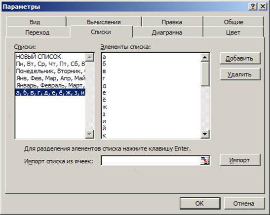 Можно создать пользовательский список автозаполнения или порядка сортировки (свой список). Для этого используется команда " Сервис "-" Параметры " - вкладка " Списки " (Рис. 21.)