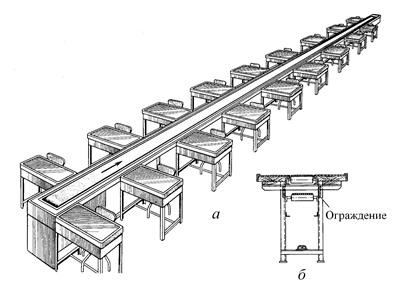 Рис. 3.28. Ленточный конвейер для пооперационного перемещения изделий между рабочими местами: а – общий вид; б – поперечное сечение