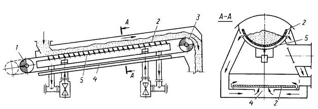 Рис. 3.30. Схема конвейера с лентой на воздушной опоре: 1 – натяжной барабан, 2 – лента, 3 – приводной барабан, 4, 5 – воздушные камеры