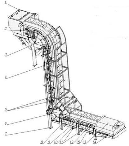 Рис. 3.31. Конструктивная схема Z -образного конвейера: 1 – бункер; 2 – приводная станция; 3 – оголовок; 4 – сеточное ограждение; 5 – успокаивающие ролики; 6 – прижимающая станция; 7 – опора; 8 – дефлекторный ролик; 9 – лента с ребрами и гофробортом; 10 – ролик; 11 – поддерживающие ролики; 12 – амортизирующий ролик; 13 – кожух натяжной станции; 14 – натяжная станция; 15 – рама