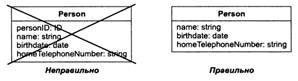 Согласно системе обозначений UML, атрибуты указываются во втором (сверху) отделе прямоугольника, обозначающего класс. После каждого атрибута могут быть указаны необязательные сведения о нем (например, тип и значение по умолчанию). Перед значением по умолчанию ставится знак равенства. Мы указываем название атрибута обычным шрифтом (не полужирным) и первую букву названия не делаем заглавной. Во втором отделе прямоугольника объекта могут быть указаны значения атрибутов. В этом случае после названия атрибута ставится знак равенства, после которого записывается значение этого атрибута. Значения атрибутов мы выравниваем по левому краю и не выделяем их полужирным шрифтом. Иногда среда реализации может требовать наличия у объекта уникального идентификатора. Идентификаторы всегда неявным образом присутствуют в модели классов. Их не следует указывать явно (рис. 3). Большинство объектно-ориентированных языков генерируют идентификаторы для ссылок на объекты автоматически. Так же легко определить идентификаторы и для баз данных. Идентификаторы являются артефактом вычислительной системы и не имеют внутреннего смысла.