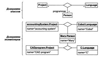 На рис. 30 показана настоящая тернарная ассоциация, не сводимая к бинарным: программисты используют в проектах языки программирования. Эта ассо-циация является атомарной и не может быть разделена на бинарные без потери информации. Программист может знать язык и участвовать в проекте, но не использовать этот язык в данном проекте.