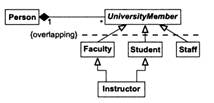 Множественная классификация Экземпляр класса неявным образом является экземпляром всех предков этого класса. Например, преподаватель может одновременно принадлежать к профессорско-преподавательскому составу и к учащимся. Но может ли профессор Гарвардского университета слушать лекции в Массачусетсском технологическом институте? Такая комбинация не описывается никаким классом (если бы он существовал, это было бы крайне искусственное построение). Это пример множественного наследования, при котором один экземпляр относится к двум перекрывающимся классам. Язык UML допускает множественную классификацию, но большинство объектно-ориентированных языков поддерживают ее довольно плохо. При использовании традиционных языков лучше всего работать с Person как с объектом, состоящим из множества объектов UniversityMember (ЧленУниверситета) (рис. 41). Такой обходной маневр заменяет наследование делегированием (о котором речь пойдет в следующем разделе). Правда, при этом теряется индивидуальность отдельных ролей, однако альтернативные подходы потребовали бы радикальных изменений во многих языках программирования.