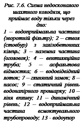 Складається шахтний колодязь з водоприймальної частини 1, ствола 2 і надземної частини (оголовка) 3 (рис. 7.6). Часто для створення запасів води і її відстоювання він може мати водозбірну чи відстійну частину, а для вентиляції – вентиляційну трубу, яка виводиться вище поверхні землі не менше ніж на 2 метри. Водоприймальною частиною шахтного колодязя в залежності від його конструкції, потужності водоносного пласта і властивостей водоносної породи може бути його дно, бокова поверхня або те і інше одночасно. Будуються шахтні колодязі з цегли, каменю, дерева, бетону і залізобетону з таким розрахунком, щоб ствол і надземна частина були достатньо міцними і водонепроникними для запобігання потрапляння поверхневих вод і забруднених вод зони аерації. Горизонтальні водозабори улаштовують в межах водоносного пласта на глибині 6...8м. при незначній його потужності. Водозабір розташовують перпендикулярно до напряму руху ґрунтового потоку з похилом у бік збірного колодязя, звідкіля вода забирається насосами. (рис. 7.7).