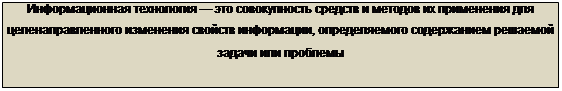 различные области человеческой деятельности требуют и различных технологий. Различия технологий проявляются в том, на что направлена деятельность людей в той или иной сфере, т. е. в объектах технологий. Для промышленного производства, как уже указывалось, это сырье, Материалы, полуфабрикаты — все, что составляет материально-вещественные ресурсы производства. Если в качестве объекта деятельности, а следовательно, и соответствующих способов ее осуществления выступают энергетические ресурсы (например, электрическая энергия), то мы получаем энергетические технологии (производство, передача, преобразование, распределение, потребление энергии). Финансовые ресурсы как объект деятельности порождают финансовые технологии (банковские и бухгалтерские технологии, технологии работы на рынке ценных бумаг, технологии финансового и экономического анализа и т. п.). Информация как общественный ресурс тоже является объектом деятельности и, следовательно, связана с соответствующими технологиями — информационными технологиями. Опираясь на рассмотренное содержание понятия «технология», можно сформулировать следующее определение понятия «информационная технология»: