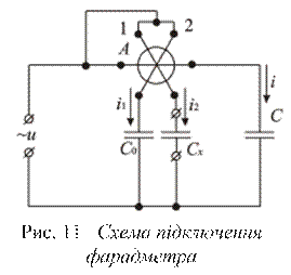 Недоліки Вимірювання ємності фарадметром Фарадметр - логометр електродинамічної системи. Нерухому котушку логометра з'єднують послідовно з конденсатором постійної ємності С і підключають