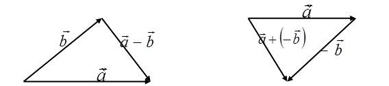 Різницю векторів та записують у виді . Отже, запис , згідно з означенням різниці векторів, означає, що . Звідси випливає спосіб побудови вектора , який є різницею векторів та , а саме: вектори та відкладають із спільного початку, а потім, сполучивши кінці векторів , та вибравши напрям шуканого вектора від кінця до кінця вектора , одержують вектор (рис. 4). Очевидно, що різницю векторів та можна одержати, додаючи вектори та (рис. 5), тобто для різниці векторів виконується рівність .