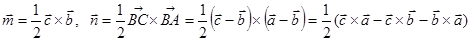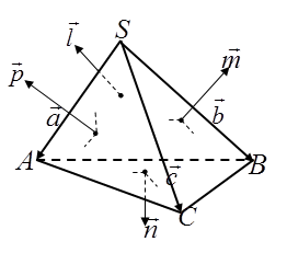 Розв’язання. Нехай - задана піраміда, , а також - вектори, які задовольняють умову задачі та проведені до граней відповідно (рис. 5). Обчислимо вектори, як половини векторних добутків векторів, напрямлених по ребрах піраміди. Орієнтацію трійок векторів вибираємо праву. Дістаємо