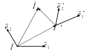 1. Розглянемо на площині дві довільні системи координат, перша з яких задається точкою та базисом , а друга – точкою та базисом . Нехай деяка точка в першій системі має координати та , а у другій - та .Знайдемо зв'язок між числами та . При цьому будемо вважати, що точка має координати , а також відомі розклади векторів через базис : . Коефіцієнти біля базисних векторів утворюють матрицю , яку називають матрицею переходу від базису до базису . Зауважимо, що дана матриця невироджена, тобто її визначник не дорівнює нулю. Справді, якщо , то виконувалася б рівність , звідки випливає пропорційність координат векторів та . А це суперечить тому, що вектори та лінійно незалежні. Із векторної рівності (рис. 1) дістаємо