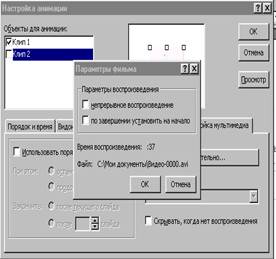 При створенні об’єктів вказаного типу слід мати на увазі, що звукові об’єкти вбудовуються у слайд презентації, а фільмові зв’язуються. Це означає, що фільмовий об’єкт повинен міститися на носії інформації разом із документом презентації, в якій він використовується. Інакше можна розраховувати виключно на його перший кадр і не більше. Останні два пункти "Запись с компакт-диска..." та "Записать звук" створюють звукові об'єкти відразу на слайді минаючи етап збереження звуку у файлі. Звуковий та фільмовий об’єкти можна налагодити таки чином, щоб вони почали працювати автоматично при перегляді слайду, або при активації кнопкою миші. Перед вставкою у слайд звукового або відео файлу Power Point дає запит "Автоматически производить звук (фильм) при показе слайдов? Если нет, то для воспроизведения потребуется щелкнуть его". Якщо натиснути кнопку "Да", то звуковий або фільмовий об’єкт почне роботу автоматично при демонстрації слайду. Якщо "Нет", то для того, щоб об’єкт запрацював, необхідно буде клікнути на ньому лівою кнопкою миші. Можна також задати неперервне відтворення об’єкту. Для цього використовується властивість анімації об’єктів.