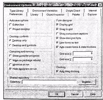 Пользователь может управлять интегрированной средой разработки, настраивая ее отдельные параметры, например, появление окна, отображающего ход компиляции проекта, или автоматическое сохранение редактируемых файлов. Установка параметров выполняется в диалоговом окне Environment Options (Параметры среды), вызываемом командой Tools/Environment Options... (Средства /Параметры среды). Все параметры объединены по группам, размещенным на отдельных страницах (рис. 1.16). Параметры среды Delphi для каждого проекта сохраняются в файле с расширением CFG. Рис. 1.16. Окно настройки параметров среды разработки Справочная система Delphi в свой состав включает: стандартную систему справки, справочную помощь через Интернет и контекстно-зависимую справочную помощь. В стандартной системе справки выделяются две составляющие, вызываемые соответственно командами Delphi Help (Помощь Delphi) и Delphi Tools (Средства Delphi) меню Help (Помощь). При задании любой из команд открывается диалоговое окно с соответствующей справочной информацией, например, Help Topics: Delphi Help (рис. 1.22).
