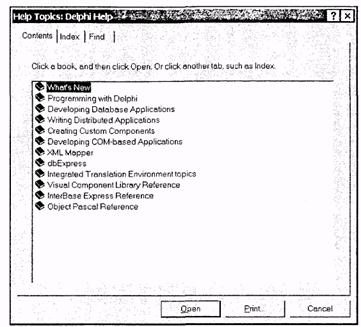 Доступ к справочной помощи через Интернет выполняется по командам меню Help, которые приводят к запуску Web-браузера, например Microsoft Internet Explorer, с открытием соответствующей Web-страницы. Так, командой Borland Home Page открывается сайт компании Borland. Вызов контекстно-зависимой справочной помощи осуществляется посредством клавиши <F1>, при этом отображаемая справка зависит от того, какой объект (диалоговое окно, пункт меню и т. п.) является активным.