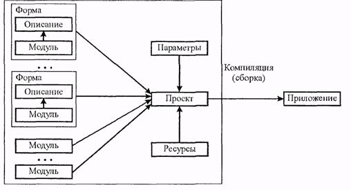 Создаваемое в среде Delphi приложение состоит из нескольких элементов, объединенных в проект. В состав проекта входят следующие элементы (в скобках указаны расширения имен файлов): П код проекта (DPR); О описания форм (DFM); П модули форм (PAS); П модули (PAS); П параметры проекта (DOF); П описание ресурсов (RES). Взаимосвязи между отдельными частями (файлами) проекта показаны на рис. 1.9.