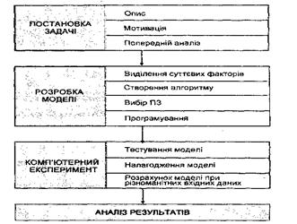 У розробці комп'ютерної моделі дуже істотним буде вибір програмного забезпечення, за допомогою якого виконується моделювання. Програмне забезпечення має ефективно розв'язувати задачі, подібні до тих, які ви розглядаєте. Наприклад, для створення малюнка на комп'ютері слід обрати той чи інший графічний редактор (який саме - залежить від необхідного формату файлу і прийомів малювання, які ви хочете застосовувати). Для розв'язання системи рівнянь маємо скористатися мовами програмування Бейсік, Паскаль або будь-якою іншою. Програмне середовище має бути адекватним поставленій задачі, тільки тоді вона може бути успішно розв'язана. Вибір програмного забезпечення й складання алгоритму - це взаємозалежні дії. Можливо, що для розв'язання поставленої задачі доведеться складати програму. Коли модель розроблено, можна розпочинати найцікавіший етап - комп'ютерні експерименти. У ході цих експериментів перевіряється робота моделі, а також виконуються необхідні розрахунки або перетворення, заради яких і створювалася модель. Перевірка моделі здійснюється звичайно за допомогою її тестування. 2. Від інформаційної моделі до програми