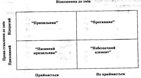 Ставлення до змін можна розглядати як комбінацію станів двох факторів: - прийняття чи неприйняття змін; - відкрите або приховане ставлення до змін.
