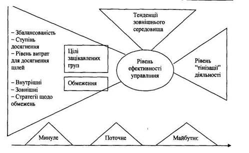 Організацію доцільно розглядати як систему із низки елементів, також менеджмент потрібно розглядати як систему. Однак діяльність такої системи варто оцінювати з різних точок зору спостерігача діяльності такої системи, а особливо цікаву інформацію для віднайдення точки ефективності системи можна отримати, коли спостерігачі не є зацікавлені у діяльності системи. Для побудови адекватної моделі оцінювання ефективності системи менеджменту організації потрібно врахувати досягнення усіх попередніх етапів розвитку менеджменту та існуючі підходи до оцінювання ефективності діяльності організації. Під час оцінювання ефективності системи менеджменту необхідно враховувати: 1) цілі основних зацікавлених груп у виробничо-господарській діяльності організації. До основних зацікавлених груп у діяльності підприємства потрібно зарахувати: акціонерів, споживачів, менеджерів, працівників, державні органи влади, контрагентів, суспільство. Роль та вплив зацікавлених груп з кожним днем зростає. Тобто оцінювання ефективності системи менеджменту змінюється залежно від того, де є спостерігач щодо об'єкта оцінювання. Як відомо, будь-яке складне явище потребує багатопланового описання, розгляду з різних точок зору і використання різноманітних методик. Основне завдання ефективного менеджменту полягає у формуванні за допомогою зацікавлених груп вектора діяльності організації, спрямованого на реалізацію власних цілей та задоволення інтересів зацікавлених груп. Тобто для ефективного функціонування організації менеджменту необхідно відмовитись від реалізації односторонніх цілей (цілей однієї із зацікавлених груп). Оскільки сконцентрувавши увагу на задоволенні односторонніх цілей, менеджмент не уникне утворення проблем та конфліктів із іншими зацікавленими групами. Швидкі темпи зростання підприємства, в якому насамперед зацікавлений менеджмент, призведе до виникнення додаткових економічних ризиків, які негативно можуть вплинути на величину акціонерного капіталу в довгостроковому періоді. Більше того, будь-яка діяльність суб'єкта господарювання може зменшувати або збільшувати рівень реалізації цілей інших суб'єктів, причому таке збільшення або зменшення може не входити до його намірів. А діяльність будь-якої системи є ефективною з погляду елемента системи (зацікавленої групи), якщо вона (система) задовольняє інтереси цього елементу. Важливо встановити баланс цілей з погляду отриманих результатів менеджментом підприємства. Оскільки підприємство може формально встановити збалансовані цілі з погляду усіх зацікавлених груп, однак виконати їх лише частково, наприклад, в частині однієї із зацікавленої групи. Також важливо врахувати співвідношення отриманих результатів від реалізації збалансованих цілей до суми витрат на досягнення цих результатів; 2) підходи та стратегію системи менеджменту щодо обмежень внутрішнього та зовнішнього середовищ підприємства. Як пише Р. Коуз: "Сучасна інституційна економічна теорія має вивчати людину такою, якою вона є, такою, яка діє в умовах обмежень, накладених реальними інституціями"158. За визначенням Д. Норта інституції - це правила гри в суспільстві або, точніше, придумані людьми обмеження, які спрямовують людську взаємодію у певне річище. І як наслідок вони структурують стимули під ч