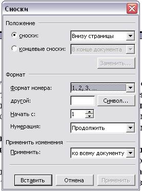 Для вставки основних або кінцевих посилань встановите курсор там, де треба помістити покажчик посилання (основну або кінцеву виноску), і дайте команду Вставка > Ссылка > Сноска. Після цього відкриється діалогове вікно Сноска. Виберіть потрібний тип виноски. Доступна як традиційна автоматична нумерація (1,2,3), так і будь-яка інша, у тому числі символьна. Автоматична нумерація, звичайно ж, простіше всього, оскільки програма Word відразу розумітиме, яким повинне бути наступне посилання. При іншому виді нумерації доведеться визначати знак кожної виноски, навіть якщо він не міняється. Для зміни формату нумерації клацніть на кнопці Параметры і виберіть переважний формат. Після вибору формату нумерації програма Word вставить знак виноски і відкриє область виноски (в звичайному режимі) або ж вкаже місце, де з'явиться виноска (в режимі розмітки). З виносками простіше працювати в звичайному режимі, оскільки текст можна ввести в область виноски, а потім клацнути на кнопці Закрыть. В режимі розмітки необхідно вказати місце введення тексту виноски. Для перегляду тексту виноски достатньо встановити покажчик на знак виноски. Якщо навести покажчик миші на знак виноски, він змінить свою форму, а потім в спливаючому вікні з'явиться текст виноски. Якщоприбрати покажчик миші, текст виноски зникне.